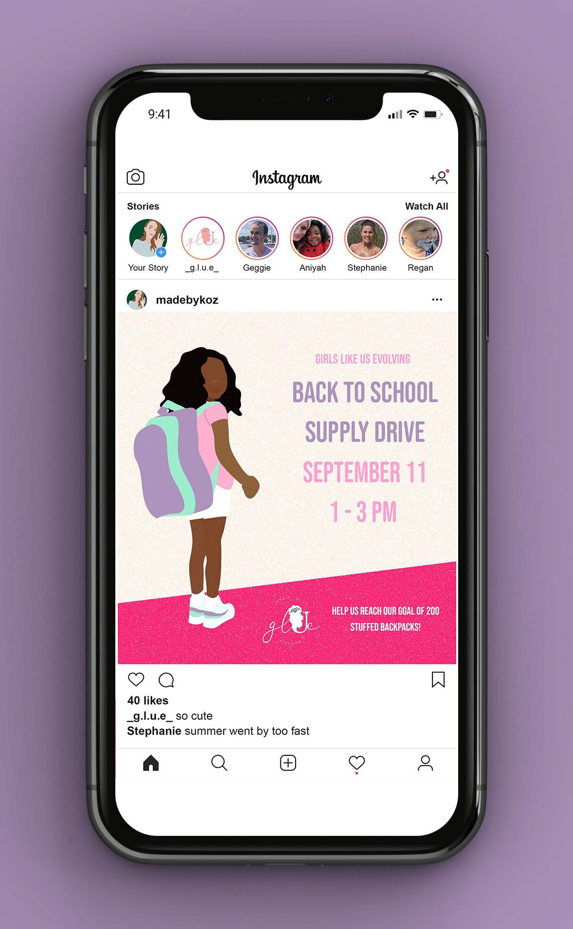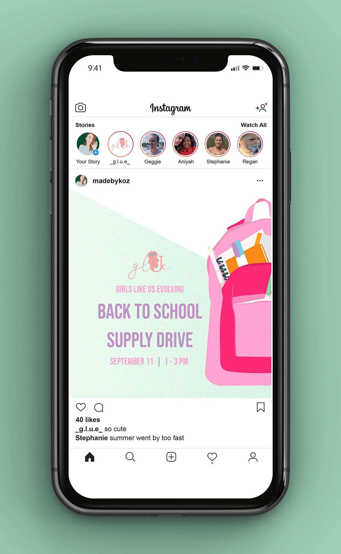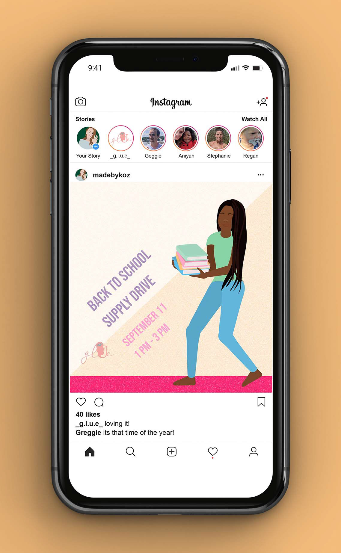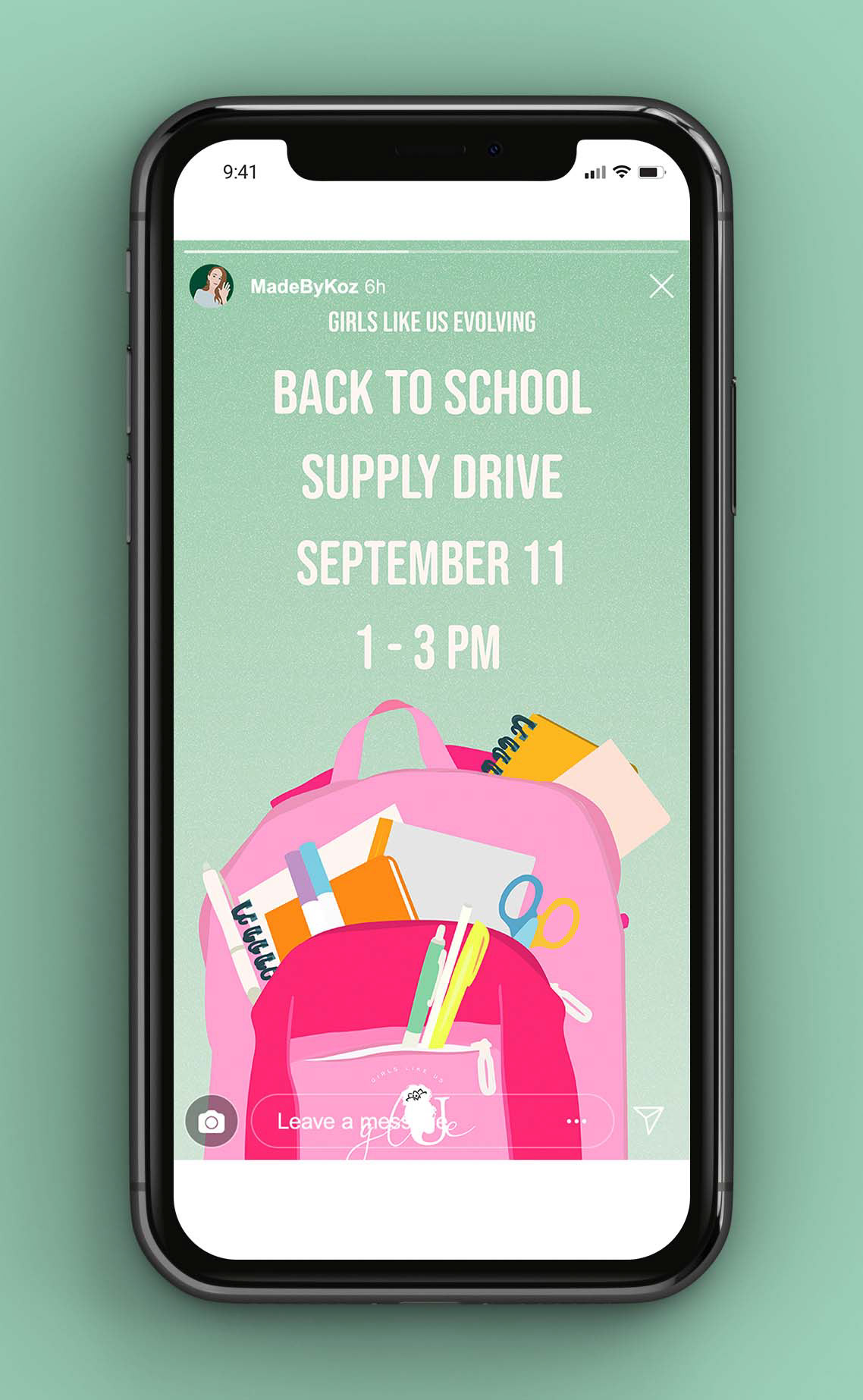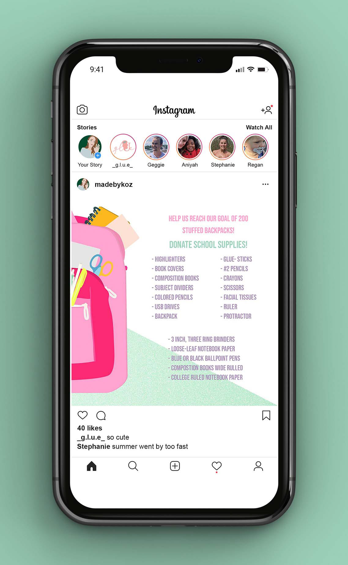 A instagram post and a coordinating story aimed at promoting the back to school supply drive. This is part two of a three part advertising series.