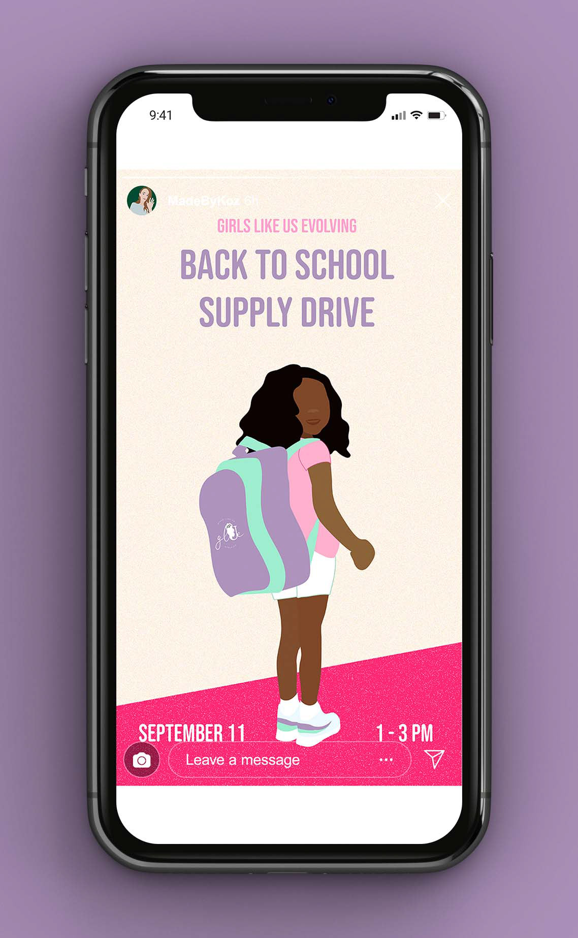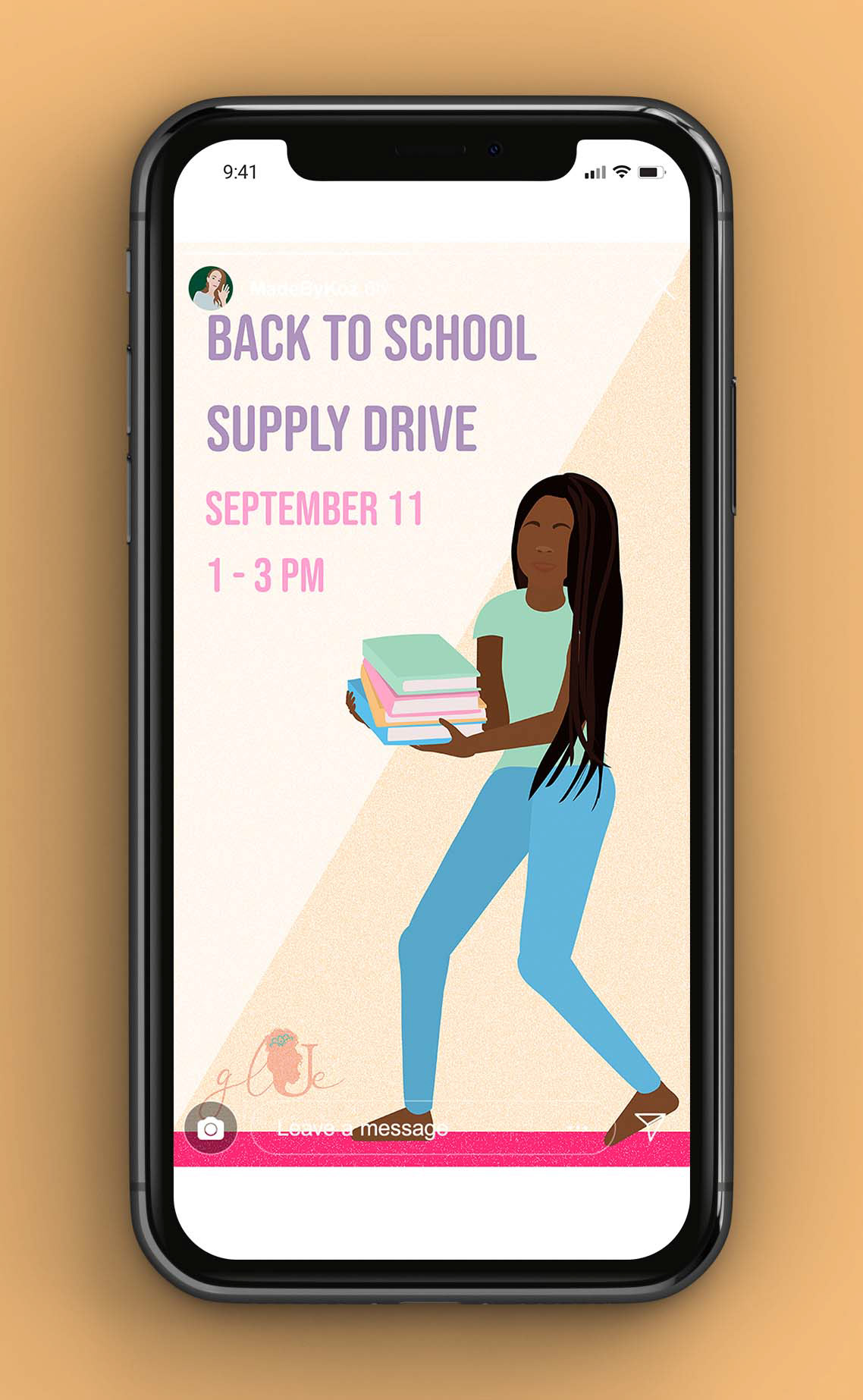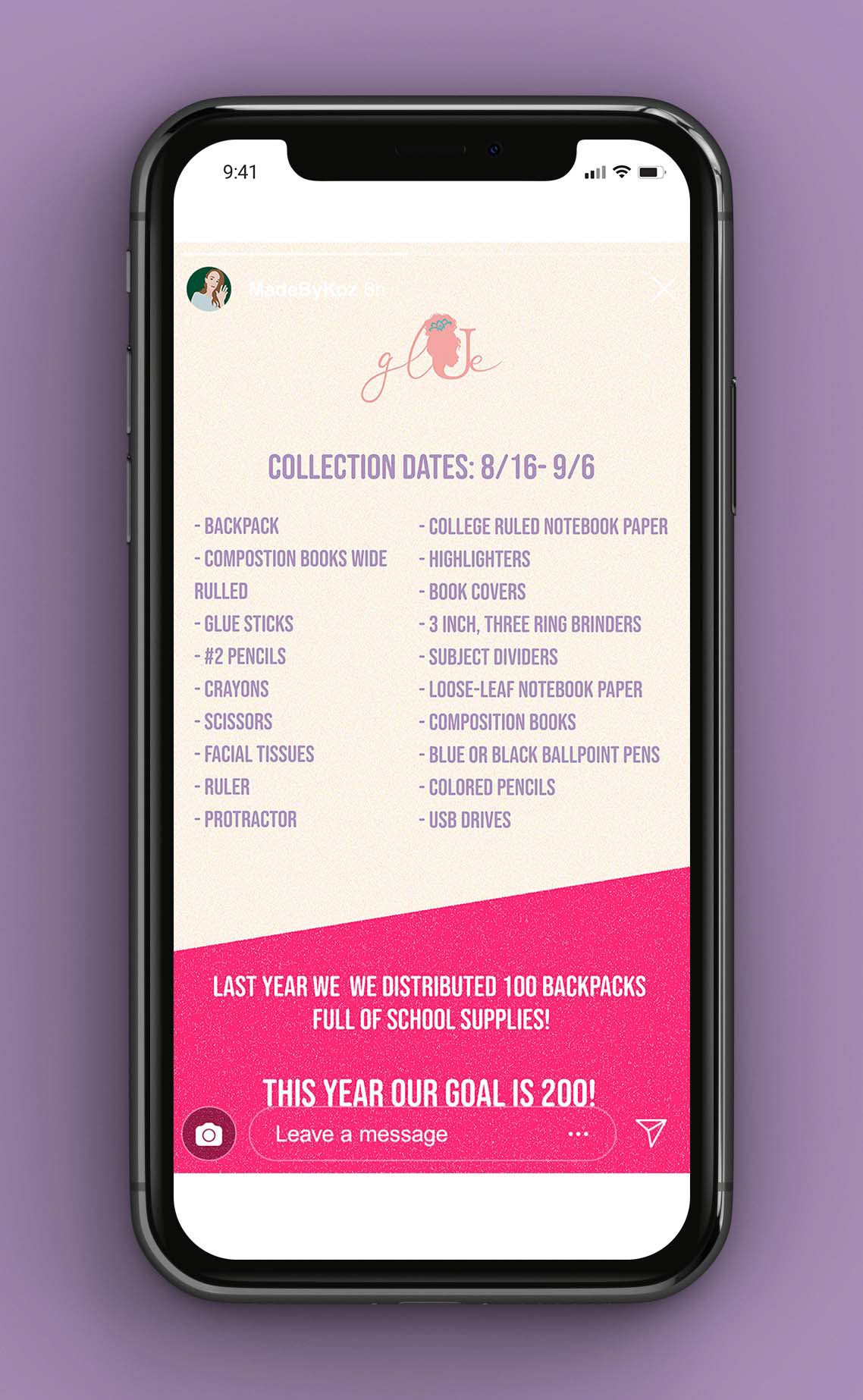 A instagram post and a 2 part story aimed at promoting the back to school supply drive. This is part one of a three part advertising series.